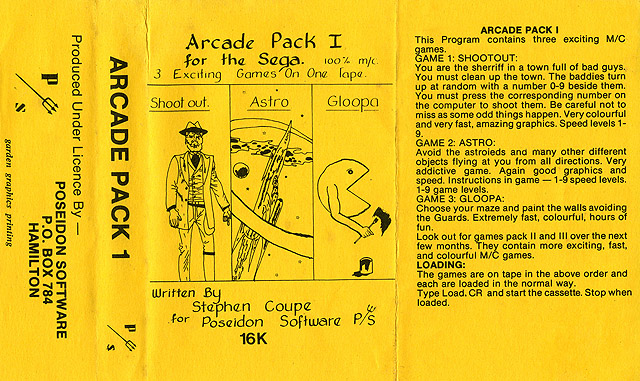 Poseidon Software from New Zealand released Arcade Packs 1, 2 and 3, on cassette tape media.